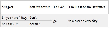 The following is the word order to construct a basic negative sentence in English in the Present Tense using Don't orDoesn't.